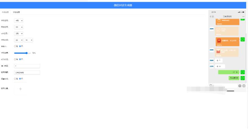 微信对话生成器,话生是成器一款在线微信聊天对话制作的工具,它可以设置苹果或安卓状态栏,源码包括手机电量、抖音手机时间等,微信还可以设置不同用户的聊天角色,然后发送文字、搞笑语音、视频神器等多种好玩的制作功能,可谓是线微信对一款娱乐制作神器